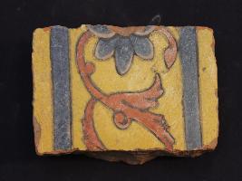 | Description / विवरण | It s a fragment of glazed tile made by terracotta with floral design on it. It is well fired and colours are red, blue and yellow. Broken from all sides. Rubbing on the surface. |