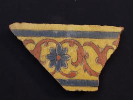 | Description / विवरण | It s a fragment of glazed tile made by terracotta with floral design on it. It is well fired and colours are red, blue and yellow. Broken from all sides. Rubbing on the surface. |