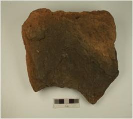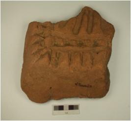 | Description / विवरण | A handmade terracotta brick, grooved lines and notches visible on surface, of coarse fabric, ill fired and treated with red slip. |
