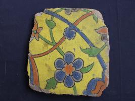 | Description / विवरण | It s a fragment of glazed tile made by terracotta with floral design on it. It is well fired and colours are red, blue, green and yellow. Broken from all sides. Rubbing on the surface. |