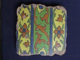 | Description / विवरण | It s a fragment of glazed tile made by terracotta with floral design on it. It is well fired and colours are red, blue, green and yellow. Broken from all sides. Rubbing on the surface. |