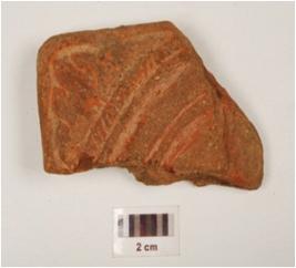 | Description / विवरण | A fragment of hand made rectangular decorated brick has incised vertical strokes within horizontal bands and floral design. |