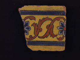 | Description / विवरण | It s a fragment of glazed tile made by terracotta with floral design on it. It is well fired and colours are red, blue and yellow. Broken from all sides. Rubbing on the surface. |
