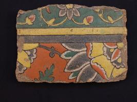 | Description / विवरण | It s a fragment of glazed tile made by terracotta with floral design on it. It is well fired and colours are red, blue, green, white and yellow. Broken from all sides. Rubbing on the surface. |