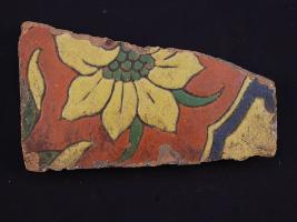 | Description / विवरण | It s a fragment of glazed tile made by terracotta with floral design on it. It is well fired and colours are red, blue, green and yellow. Broken from all sides. Rubbing on the surface. |