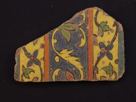 | Description / विवरण | It s a fragment of glazed tile made by terracotta with floral design on it. It is well fired and colours are red, blue, green and yellow. Broken from all sides. Rubbing on the surface. |