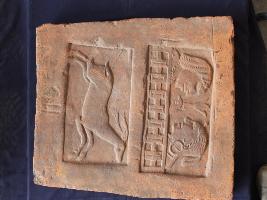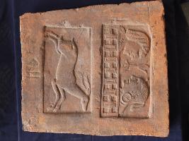 | Description / विवरण | It s a fragment of tile made by terracotta. It is well fired and colour is ochred. Damaged from all sides and couple in balcony on it. Rubbing on the surface. |