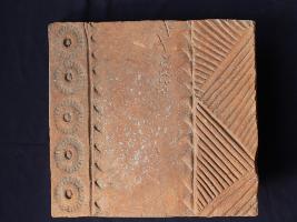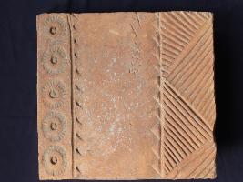 | Description / विवरण | It s a fragment of tile made by terracotta. It is well fired and colour is ochred. Damaged from two sides and well decorated. Rubbing on the surface. |