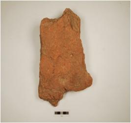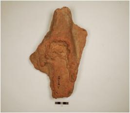 | Description / विवरण | Fragment of a tile of red ware, decorated with a hand with bracelet, of coarse fabric and showing an oxidized core. |
