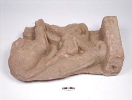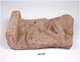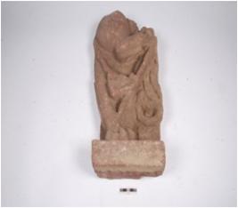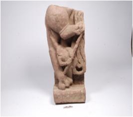 | Description / विवरण | Fragment of simha vyala made on red sandstone with broken upper body and standing on pedestal with one leg. |