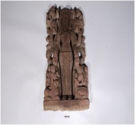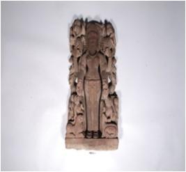 | Description / विवरण | The standing figure of parvati the face have lenticular eyes, pointed nose and the slit mouth wearing ear ornament in the ear. The tork and necklace present on the neck, the upper both hands holding lotus and the right hand is in varad mudras and the left hand holding kamandalas, the girdle of the vest wearing anklets in feet. the ram and mangoose present left side of panel and the singha present on bottom one of them holding missing. |