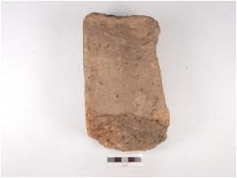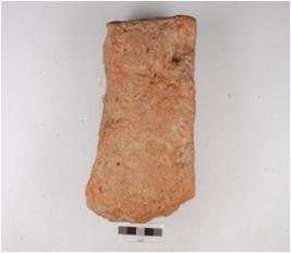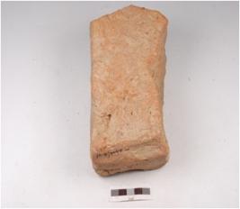 | Description / विवरण | A fragment of handmade terracotta brick, rectangular in shape, rough surface, chipped off edges, well baked and treated with wash in red colour. |