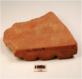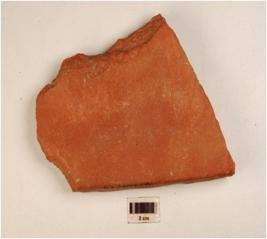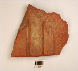 | Description / विवरण | A fragment of tile of terracotta treated with red slip and groove lines on the exterior. |