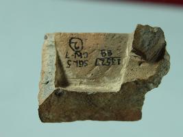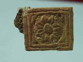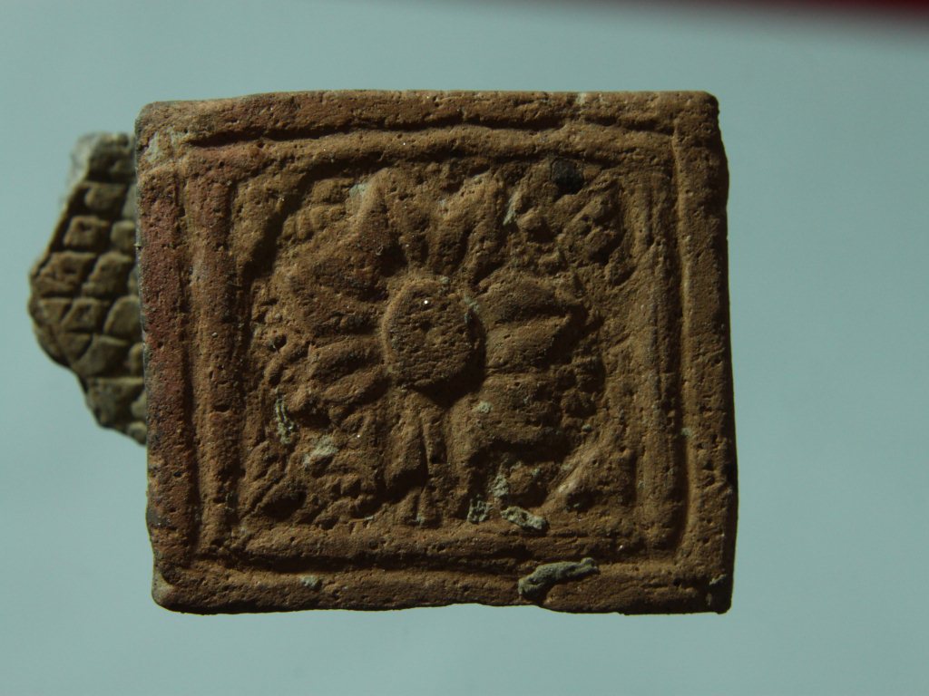 Trench CW-7 LxB-D 7-2.30 mtrs x CW-8-5.80 mtrs - 1.35 mtrs, B.peg CZ8. Stratum-layer 2.architectural member made of baked clay, by its appearance it is difficult to identify that what was the object . Flower design on its one surface. Pottery piece is damaged at all sides. Surface is rough and many marks are present all over the surface.