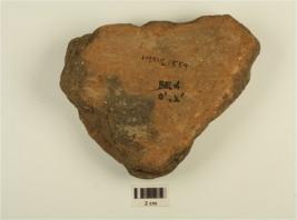 | Description / विवरण | A fragment tile of dull red ware has incised circles on the surface,of coarse fabric and showing an oxidized core. |