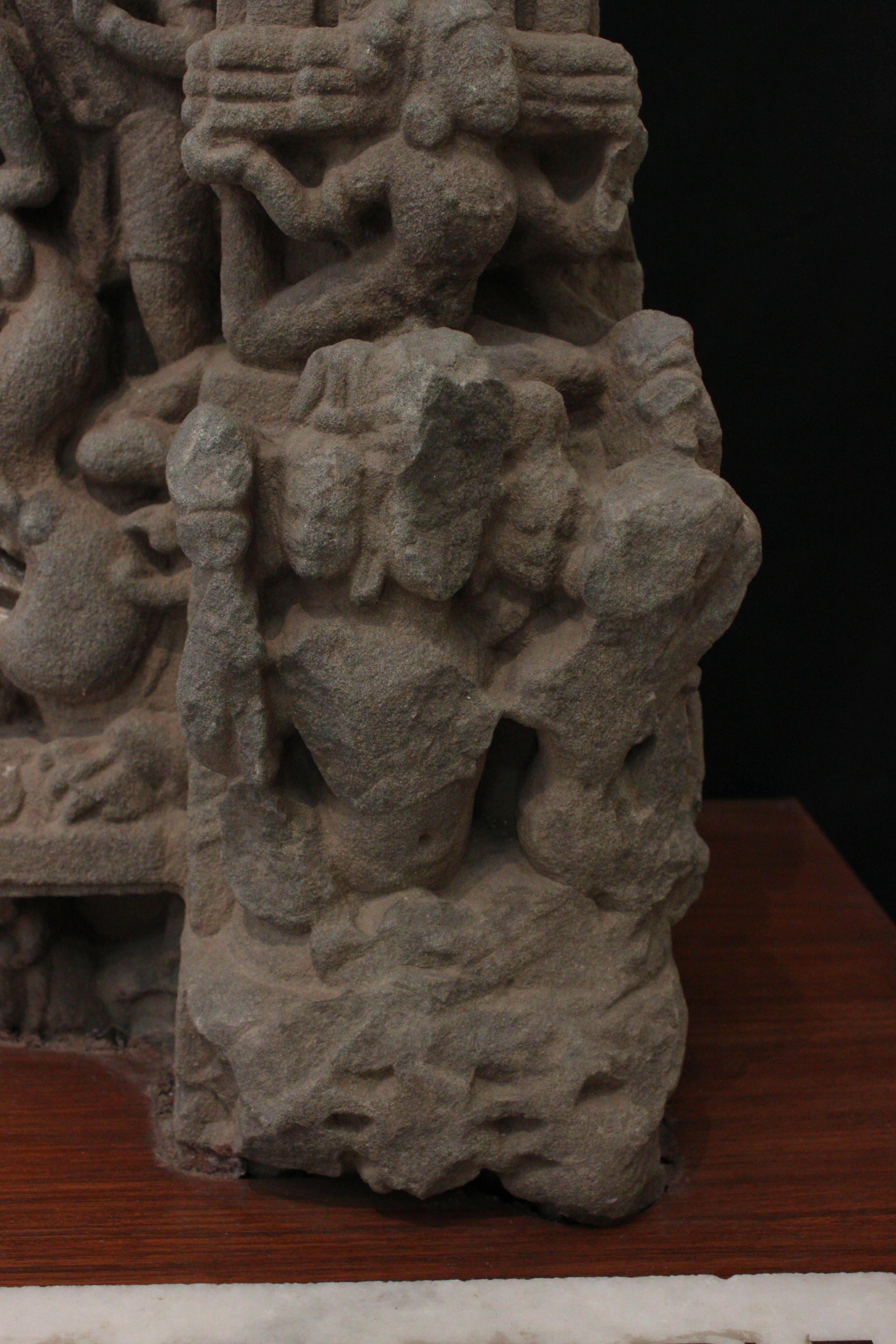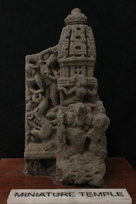 It is a miniature temple with shikhar and kalash. Lower portion is carved with many male female figures in different posture. On the lower front a trimukha shiva can be seen which is defaced now, above it is depicted a flying vidyadhara wearing beaded garland.