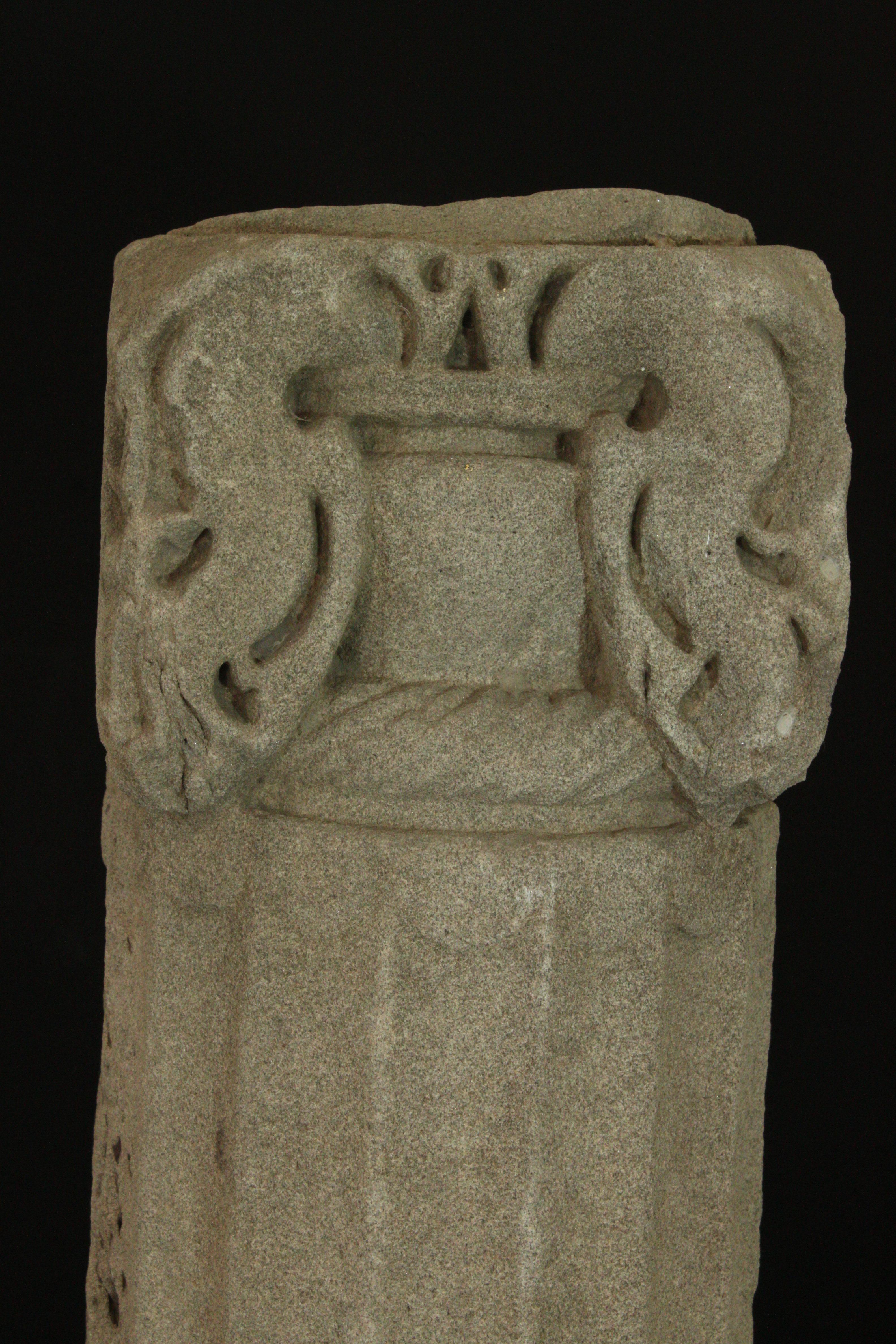 It is an architectural fragment of stone. It is four faced fragment with proper carving on each side. Top and the bottom are decorated with designs.