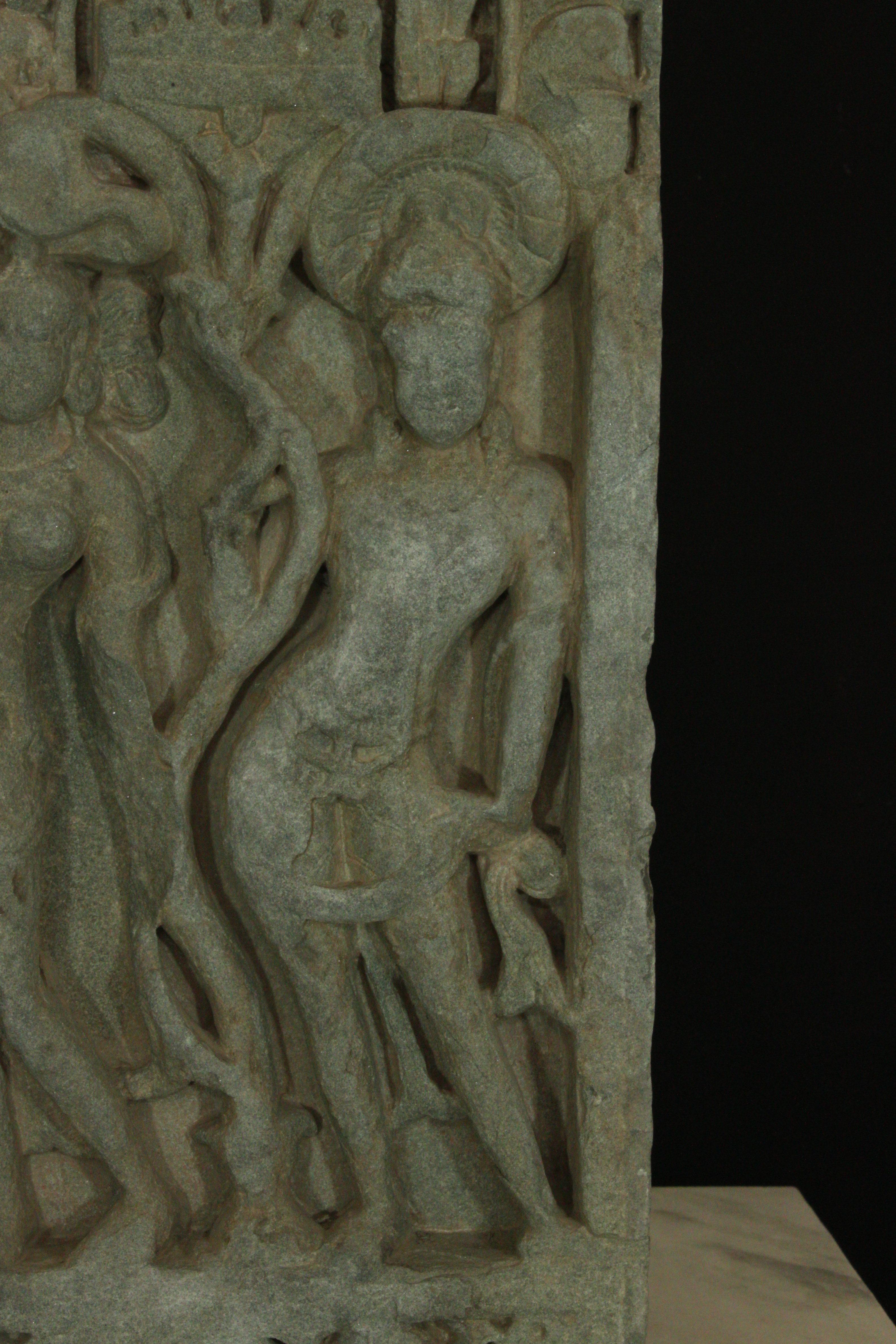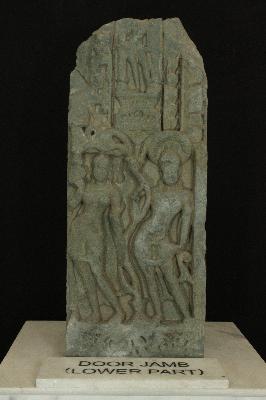 It is a door jamb an architectural fragment of some building. Lower front is decorated with a couple standing in tribhanga posture and one of them is having a chakra. A human figure is also carved on the upper portion.