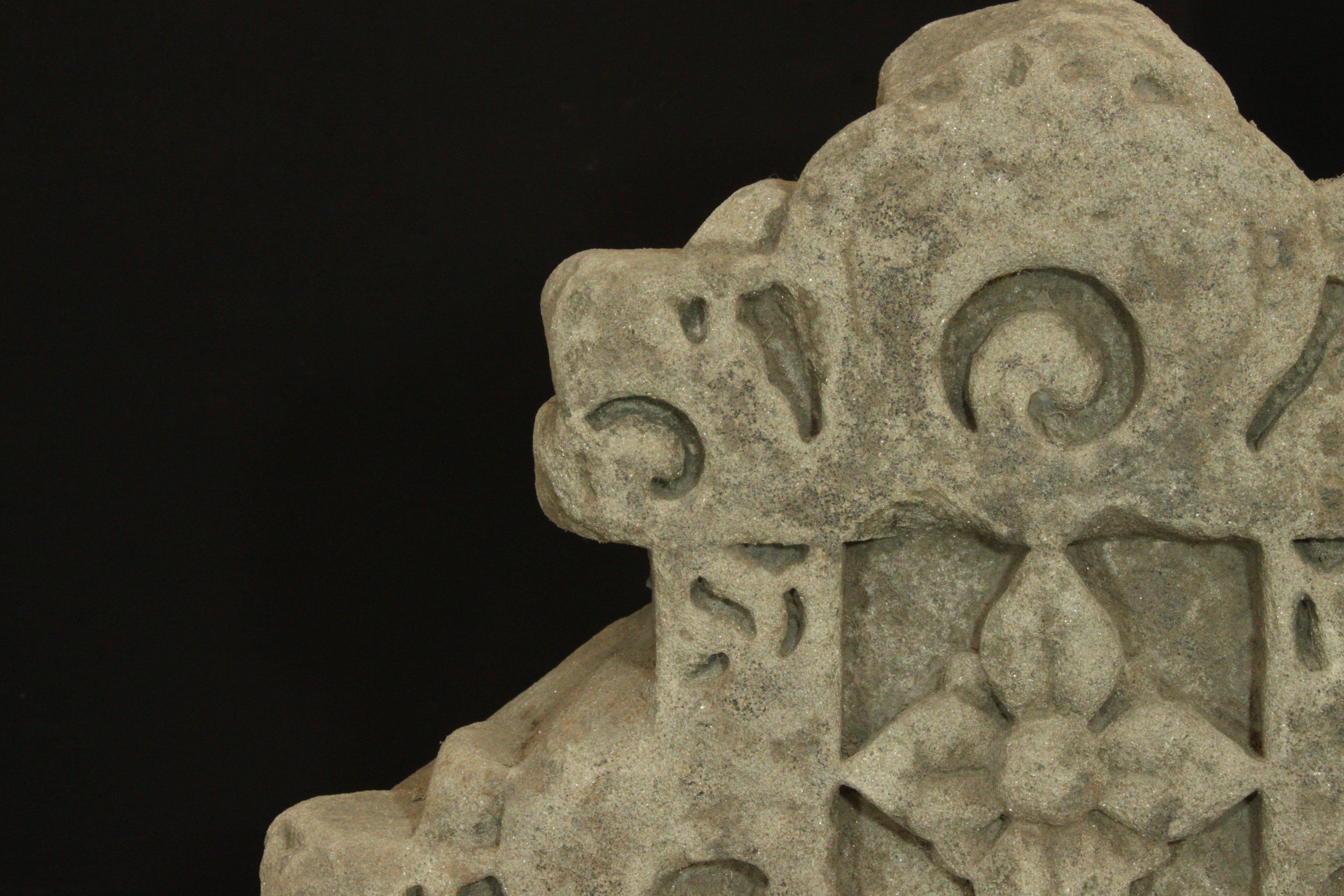 It is a miniature jali of stone. There is a square in the middle with a beautiful flower carved in it. Upper and lower portions are decorated with several designs.