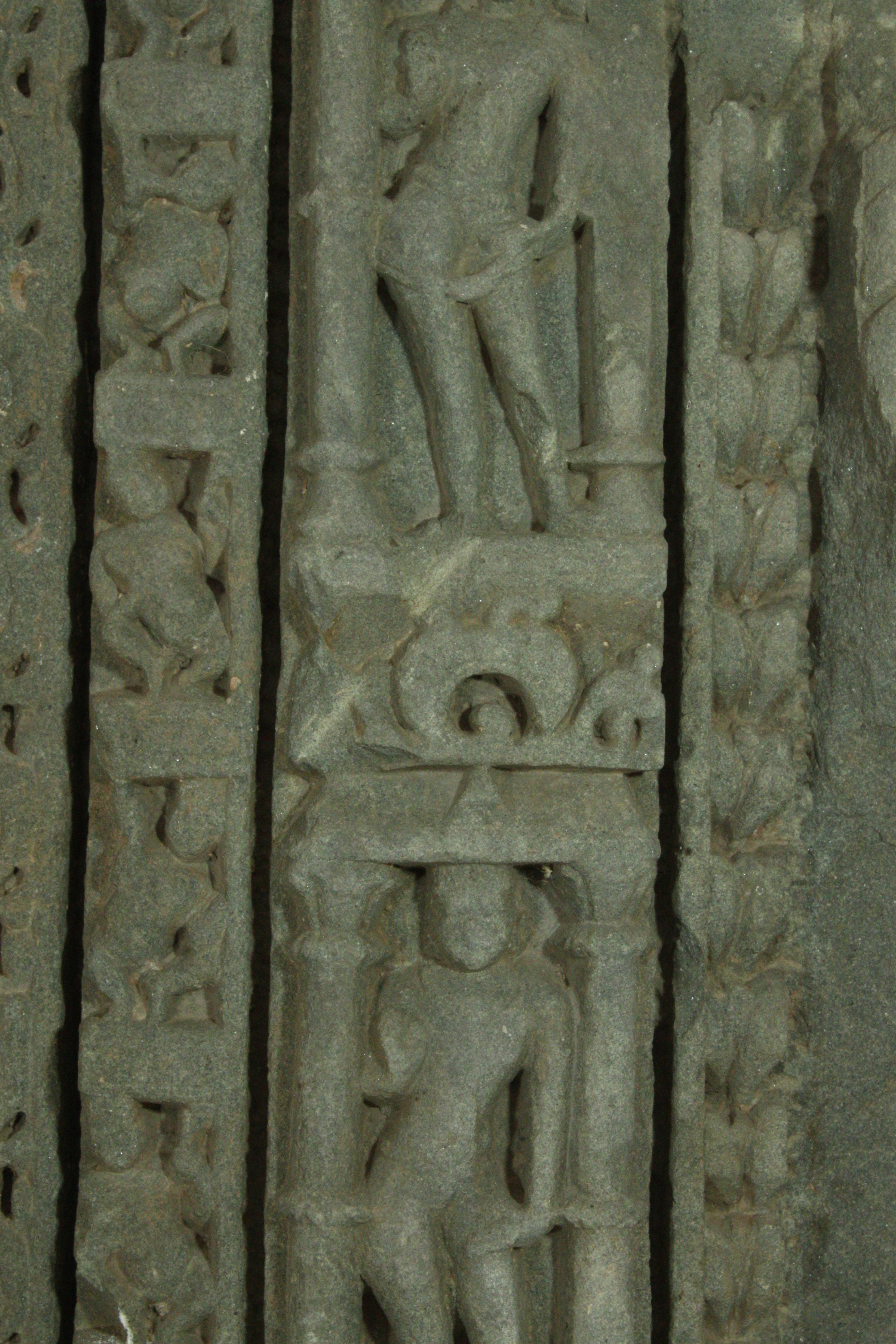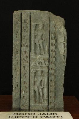 It is an upper part of door jamb. Door jamb was fixed into door to support it. Mainly two deities are present in the middle front vertically. Both are in tribhanga posture and their right hand is in vardhasta mudra. Many other figures are also carved vertically on the right side.