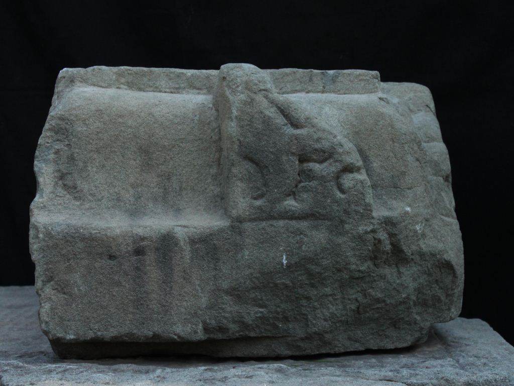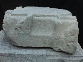 It is an architectural member of stone. There are some cuts and carving at some places. No particular design or symbol is present.