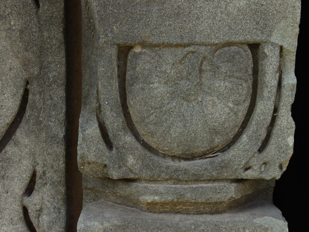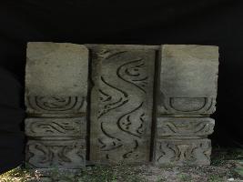 It is an architectural member of stone. Front portion is decorated beautifully. In the middle is wavy designs and both sides are designed to be seen as pillars.