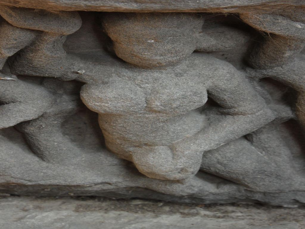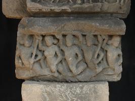 It is an architectural panel in which flying Gandharvas are carved. There are only five Gandharvas in this panel in sitting posture. Their one hand is raised above their heads and two of them are holding something in the hand. One Gandharva is holding a ball.