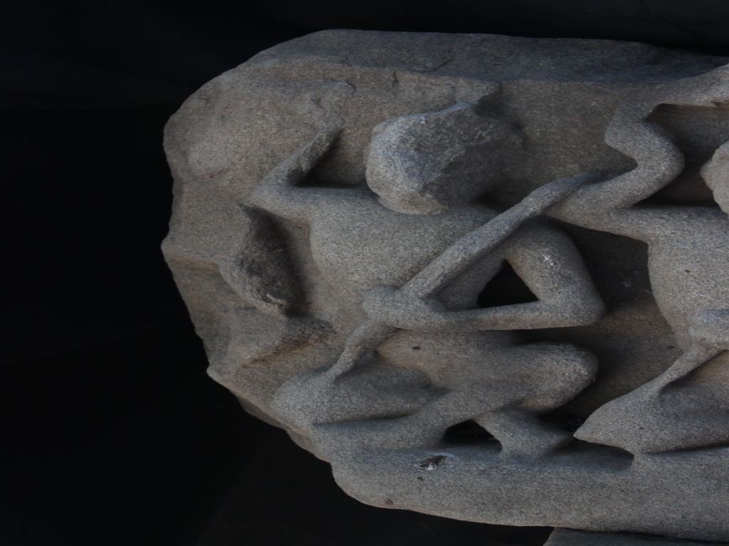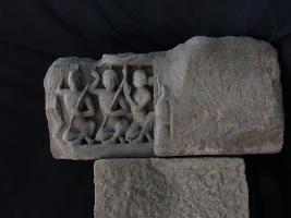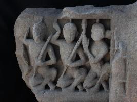 It is an architectural member of some building on which a musical panel is carved. In the panel three musicians are shown in sitting posture. Two of them are holding musical instrument and the third one is probably singing.