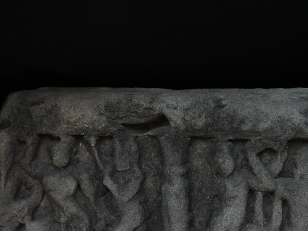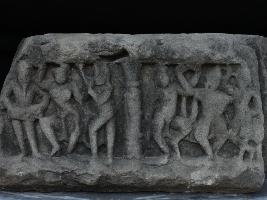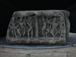 It is an architectural member made of stone, on which a dancing panel is carved. In this panel many figures, male and female, are dancing and some of them playing music.