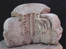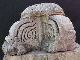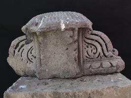 It is the top part of a stone pillar. It is parted in three sections. Inner sides of all sections are carved beautifully and lower margin is decorated with lotus petals. All sections are covered by a damaged carved cap.