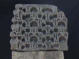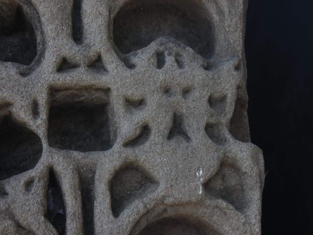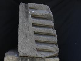 It is an architectural fragment of some temple. This particular part is called shikhara jali. Front is decorated with intricate carving and one side is done with deep horizontal lines.