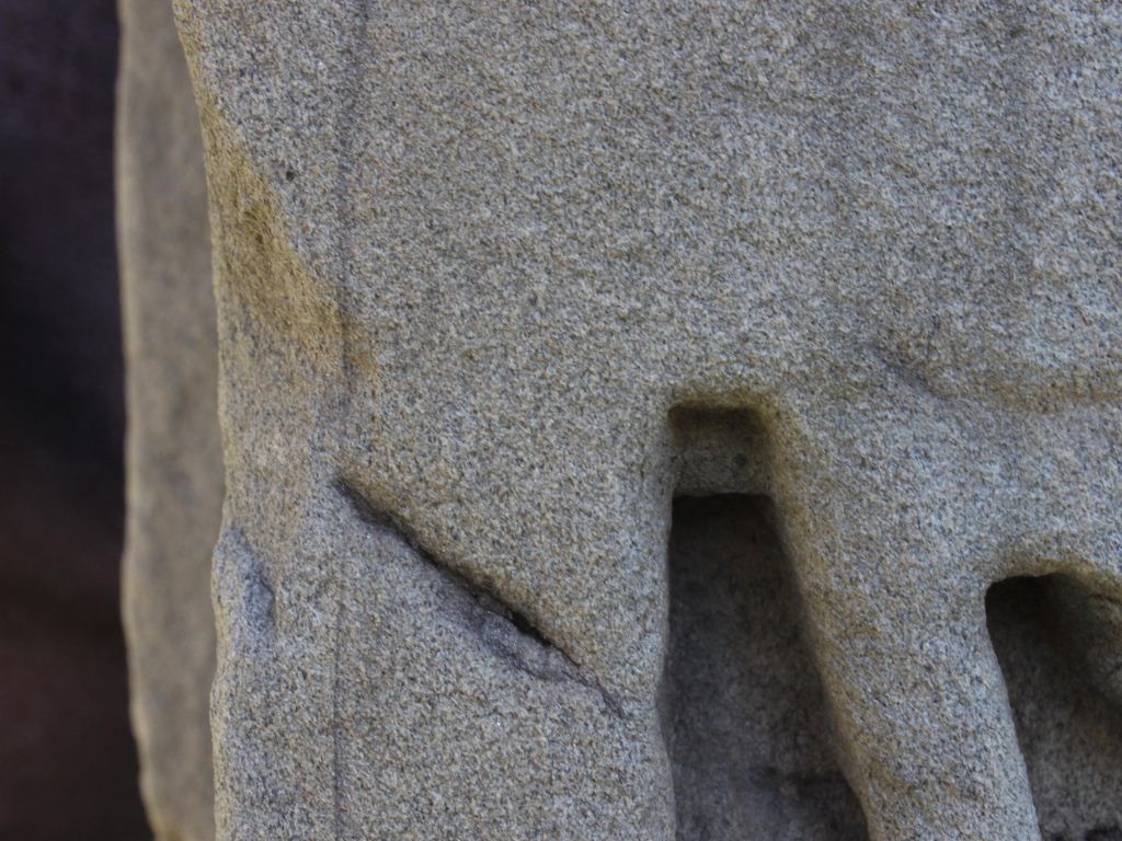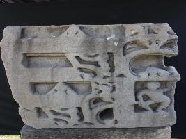 It is an architectural member of some building and a dancing figure is carved on it in a niche. There are some other designs carved on the front. There is a cut mark on the lower left side.