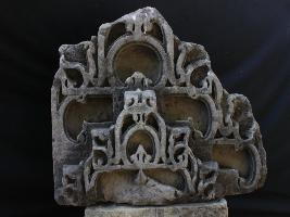 It is an architectural member of a temple. This particular part is called shikhara jali. Intricate but beautiful carving is done on the entire front.