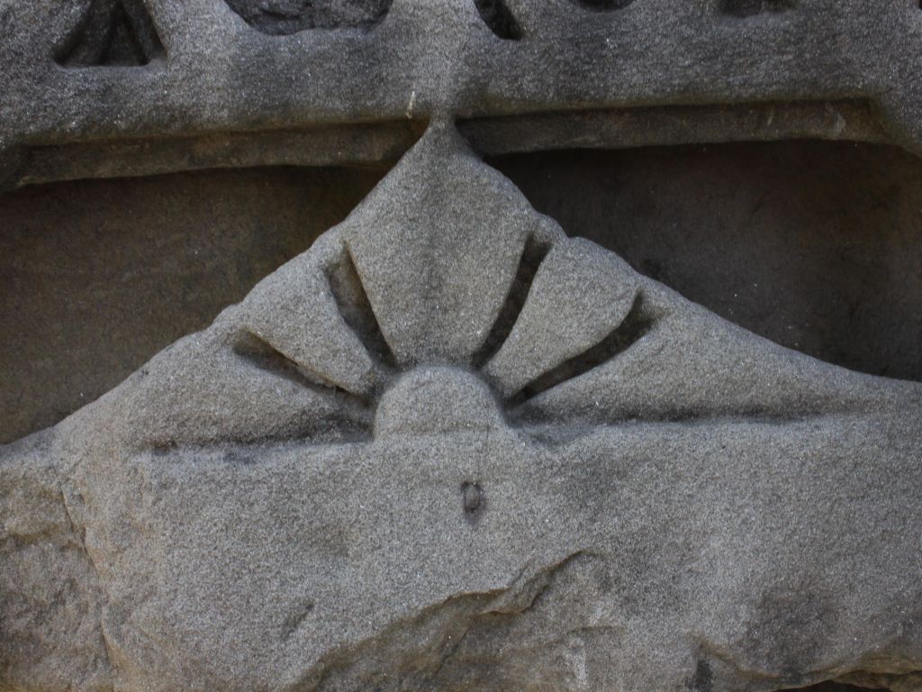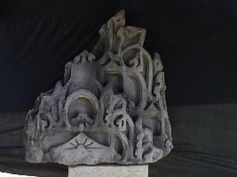 It is a part of shikhara. Intricate designs and symbols are carved on the entire front. A rising sun is carved on the lower middle portion. One conch is present on the top and other one on the right side.