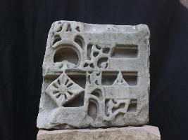 This architectural fragment is the part of shikhara. Many designs or symbols are made on the front and a sun flower is carved on a rectangular block in the lower left side.