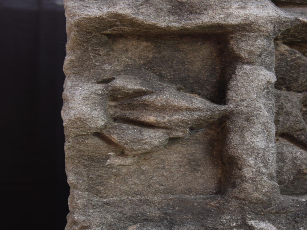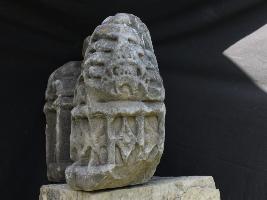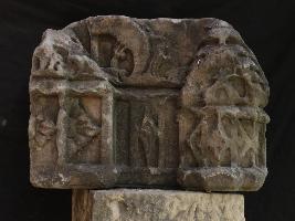 It is a temple shikhara. Shikhara is the top portion of any temple. A beautiful floral panel is carved on the front. Flowers are of different shape and size, and all are in separate niches. Some flowers are half carved and some are stretched vertically.