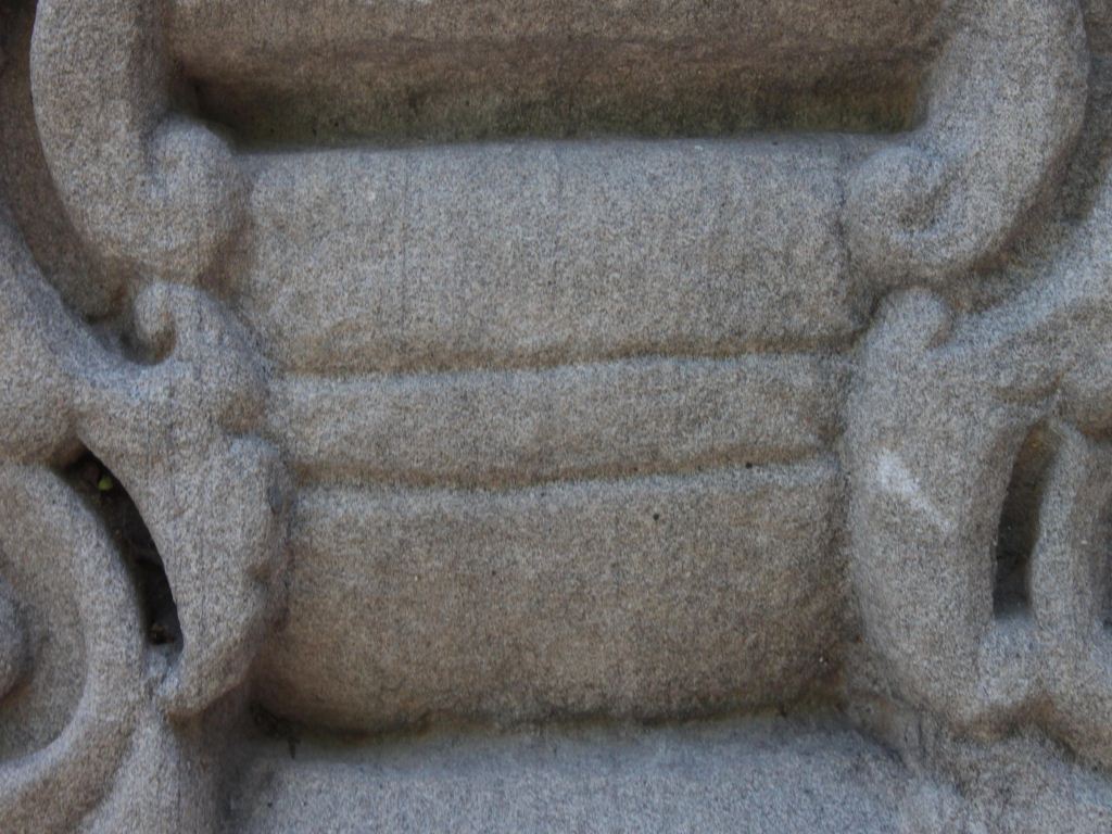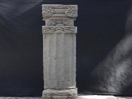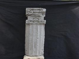 It is a stone pillar. Base is lost but top portion is present which is carved with an under cut rim pot full of floral plants and some of the plants are coming out of it. Two incised lines are present on the pot.