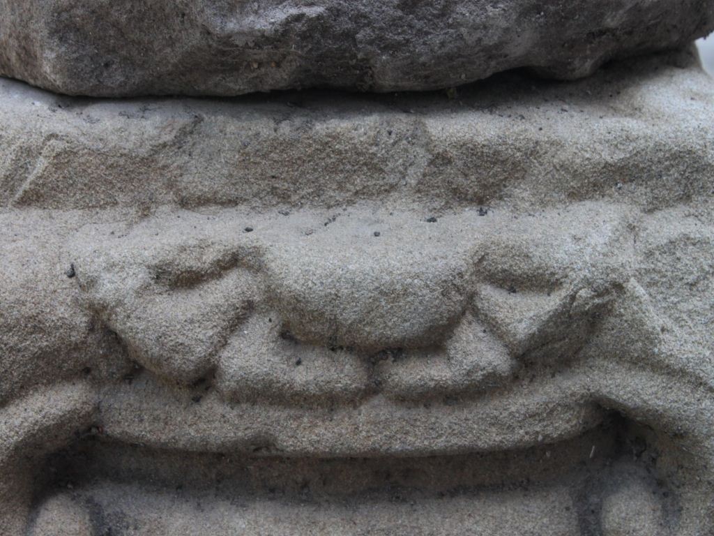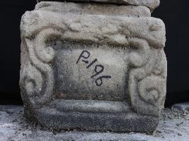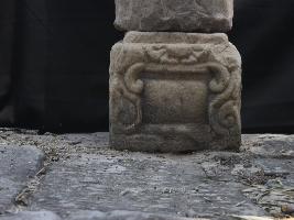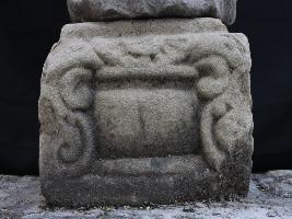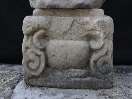 It is the base of a stone pillar. Front is carved with an under cut rim pot full of floral plants which are coming out of it.