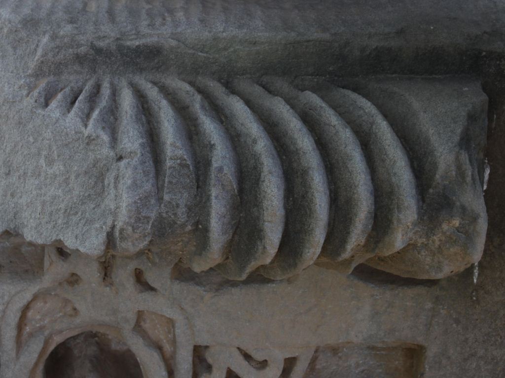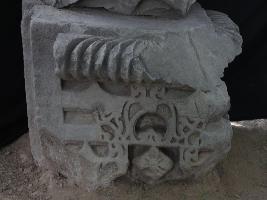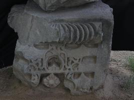 It is a part of some stone pillar. Upper margin is carved into amlaka style and lower portion is decorated with intricate but beautiful carving. A flower is carved in the lower middle portion.