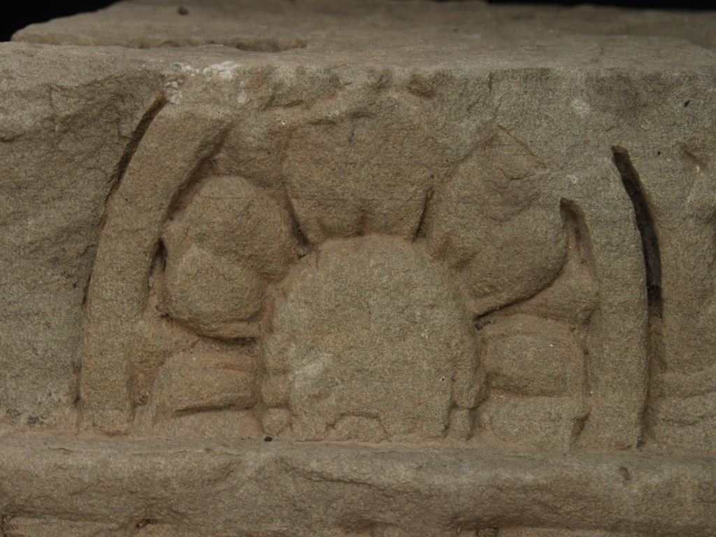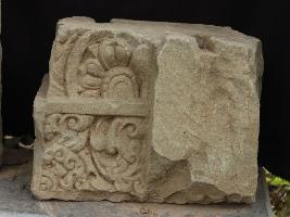It is an architectural member of some building. Lower portion is carved intricately with some designs and upper portion is carved with a chakra. Same carving is done at another.