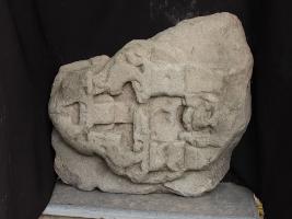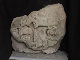 It is a part of temple shikhara. Shikhara is the top portion of any temple. Front portion is carved but due to damage and rubbing nothing is clear.