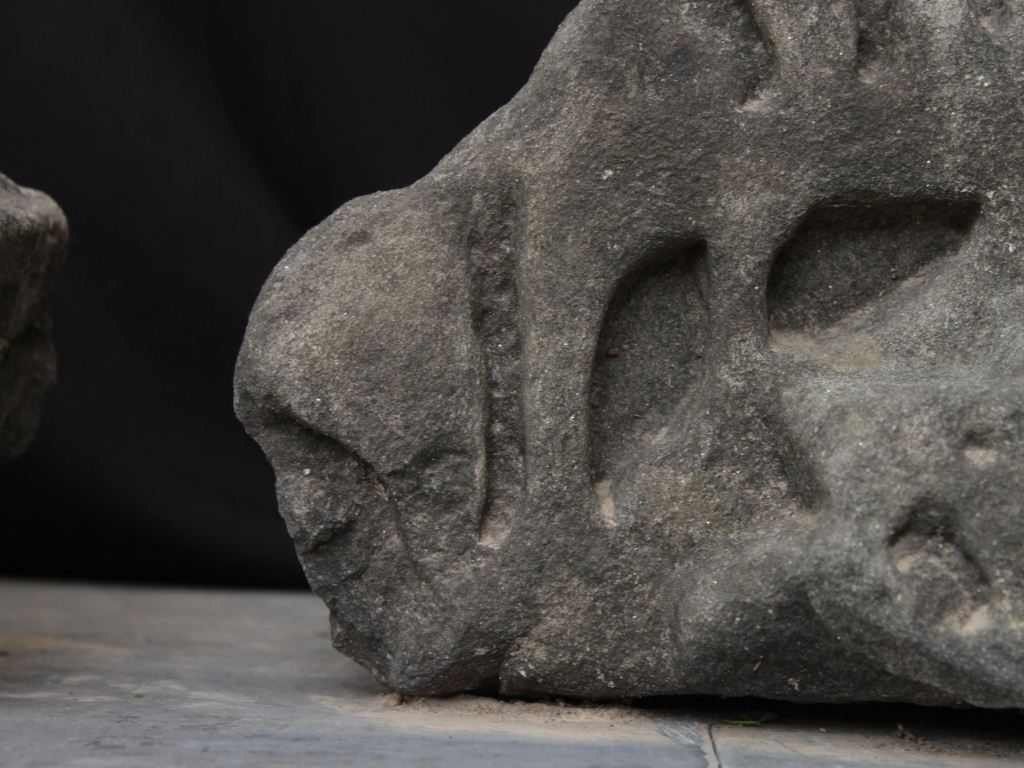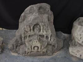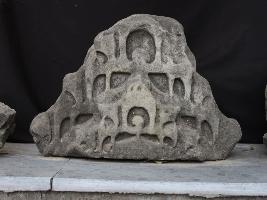 It is a Shikhara made of stone. Shikhara is the top part of temple. Intricate but beautiful carving is done on the entire front. Margin is damaged.