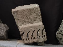 It is a broken architectural panel made of stone. Lower portion is decorated with deep and curved lines surrounded with two incised lines. Upper portion is empty and flaked.