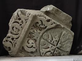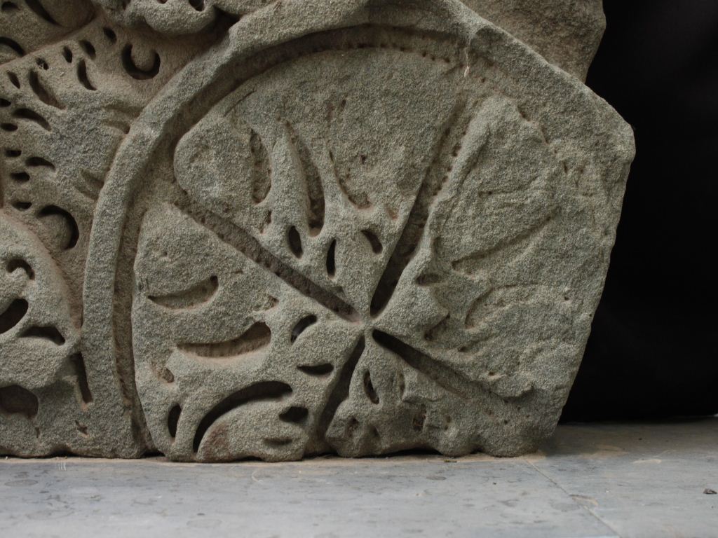 It is an architectural member of stone. Front portion is decorated beautifully. In this portion a circle with two cross lines is carved and other designing is also done on other side.