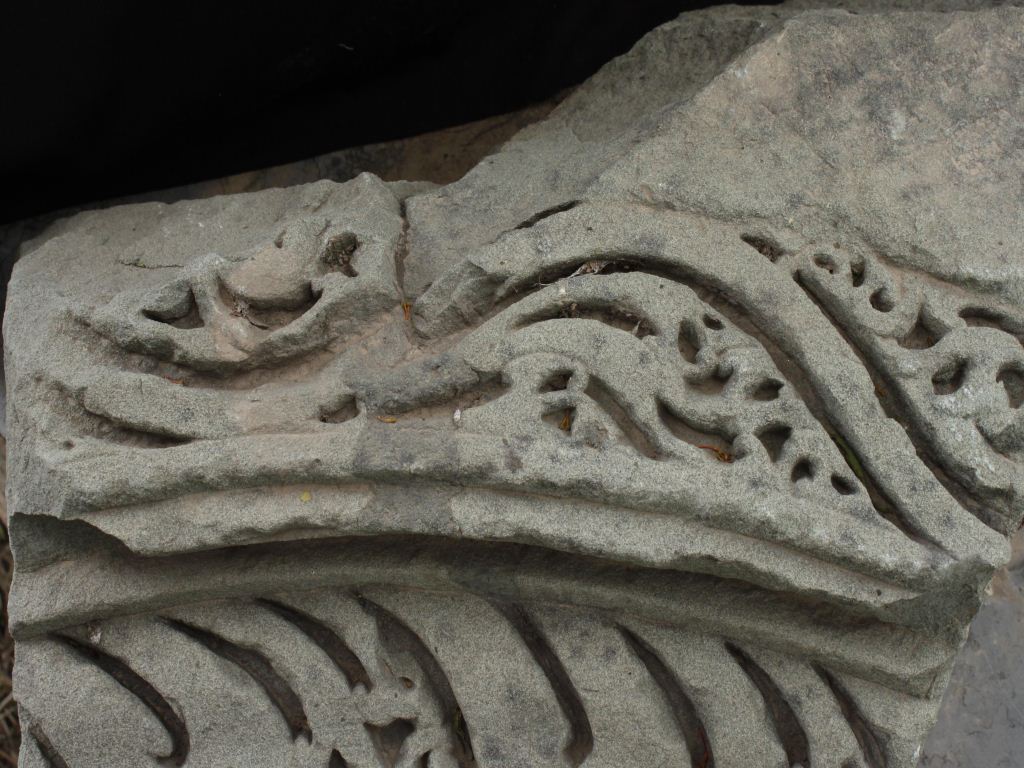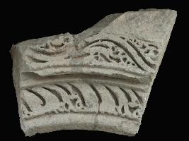 It is an architectural member of some building. Front portion is decorated beautifully. Upper half is carved with wavy designs and lower half is carved with deep but curved lines.