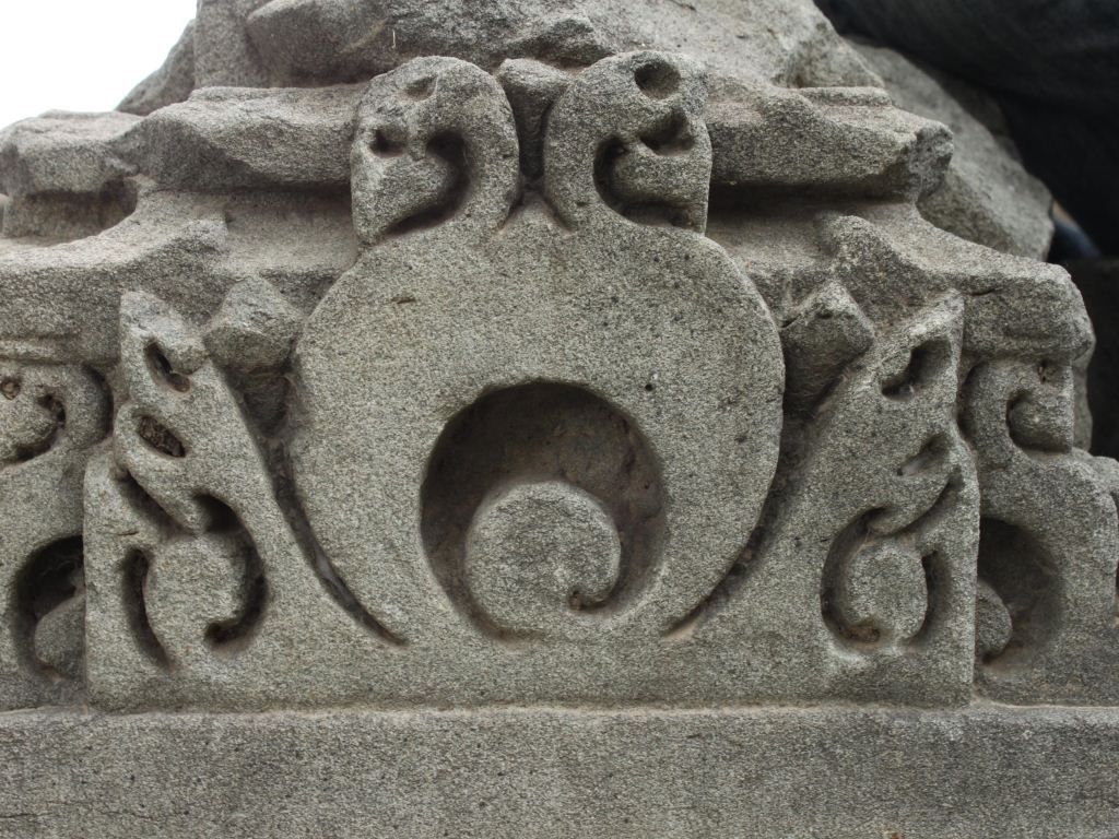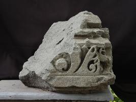It is a part of shikhara made of stone. Shikhara is the top portion of any temple. Intricate but beautiful designs are carved on front and left side. A line is incised on lower portion.
