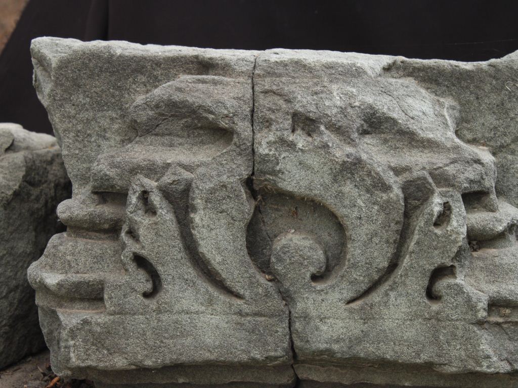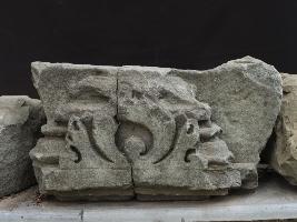 It is broken part of shikhara. Shikhara is the top portion of any temple. Front is decorated with deep and intricate designs. Vertically cracked in the middle. A long horizontal line is incised on the lower front portion.