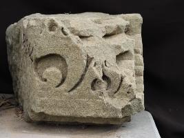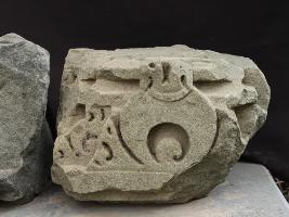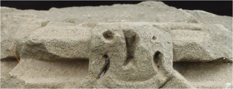 It is an architectural member of some building. Front portion is decorated with deep and intricate designs but in good manner. Right side is also decorated with deep carving. A horizontal line is incised on the front lower portion.
