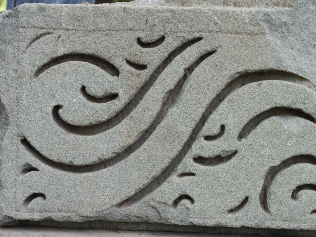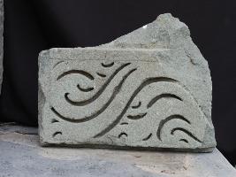It is an architectural member of some building. Front portion is decorated with wavy designs and a line is also carved along the margin.