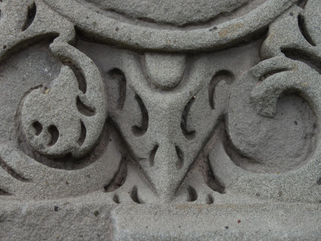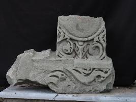 It is an architectural member of some building. Lower front is decorated with wavy designs and upper portion is carved beautifully with a triangle in the middle and some other designs.